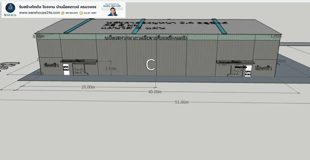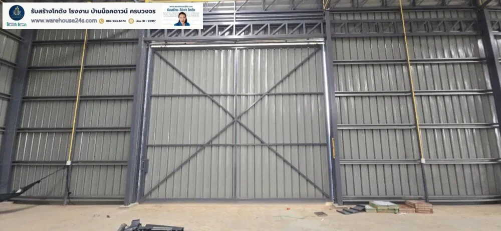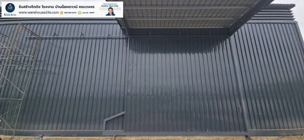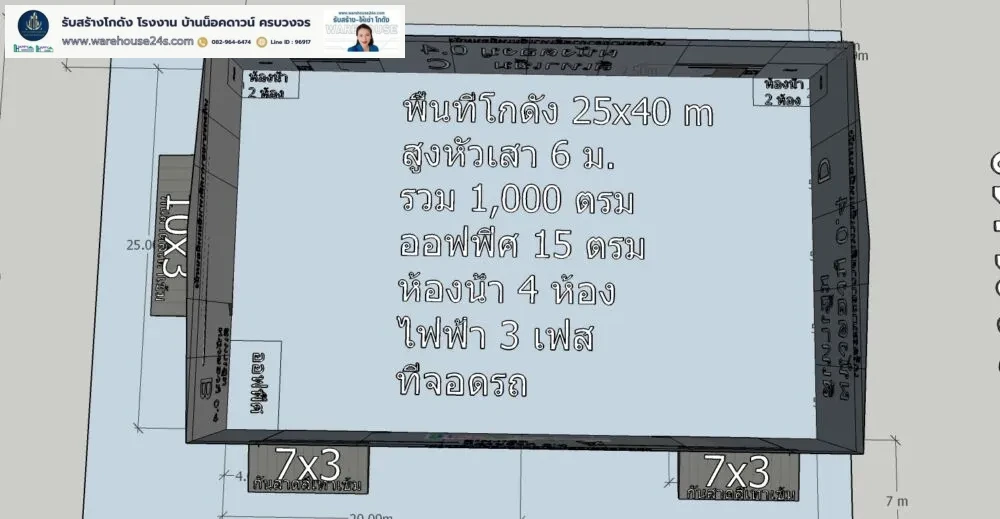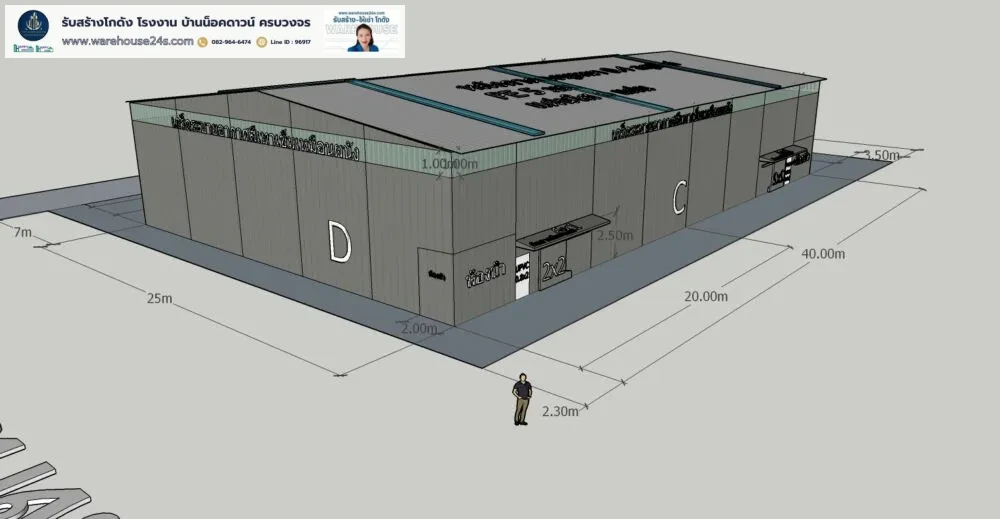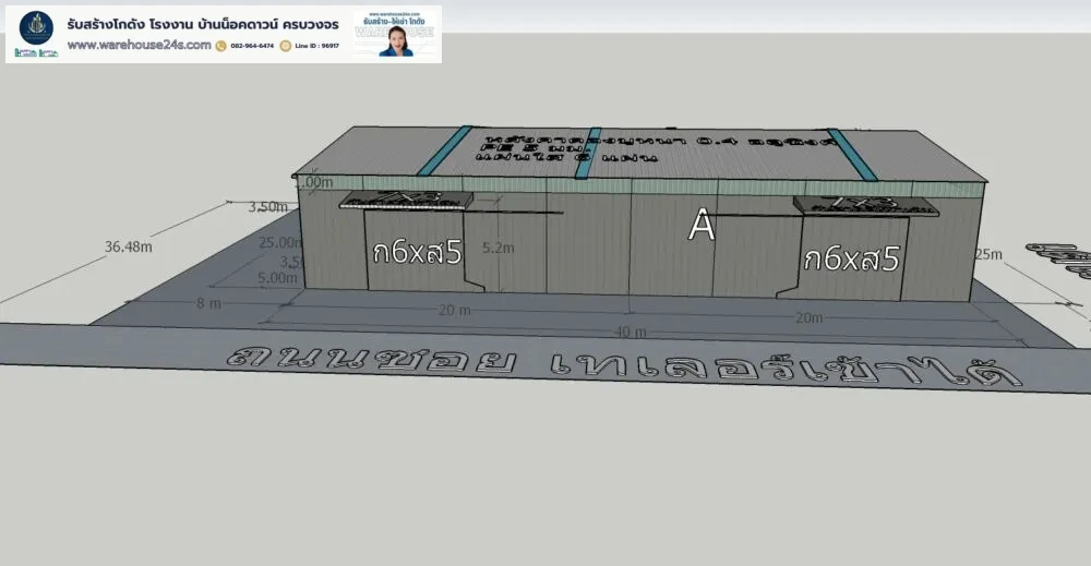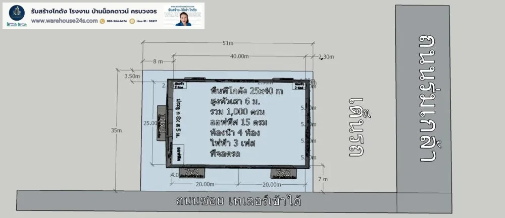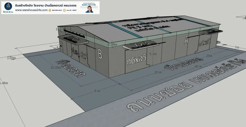 - ขนาดโกดัง : กว้าง 25 ม. x ยาว 40 ม. x สูง 7.2 ม. (ความสูงเสา 6 ม.)